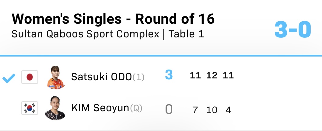 | 11/1(金)0:10 | 女子S-2回戦 | 大藤沙月WR11 3-0 KIM Seoyun(韓国)WR260![]() ![]() |