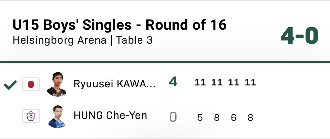 | 18:20 | T3 | 男子S-2回戦 | 川上流星 4-0 HUNG Che-Yen(台湾)![]() ![]() |