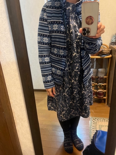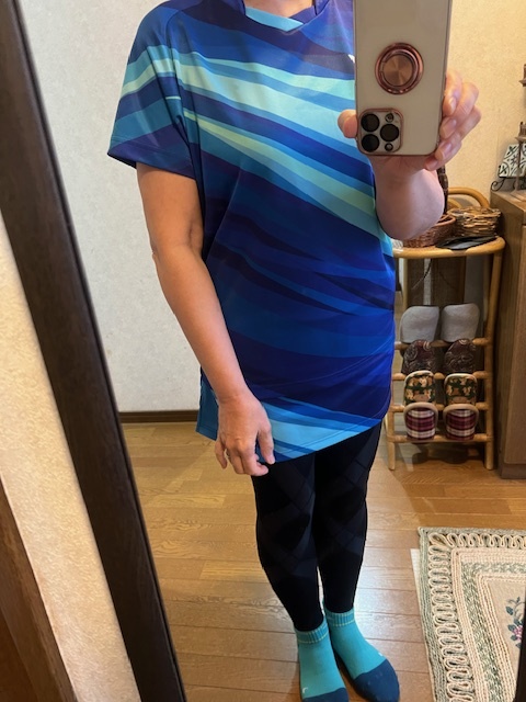 紺・青・白のワンピース、グレーのスパッツ、紺・茶・オレンジの靴下、黒のストレッチシューズ。