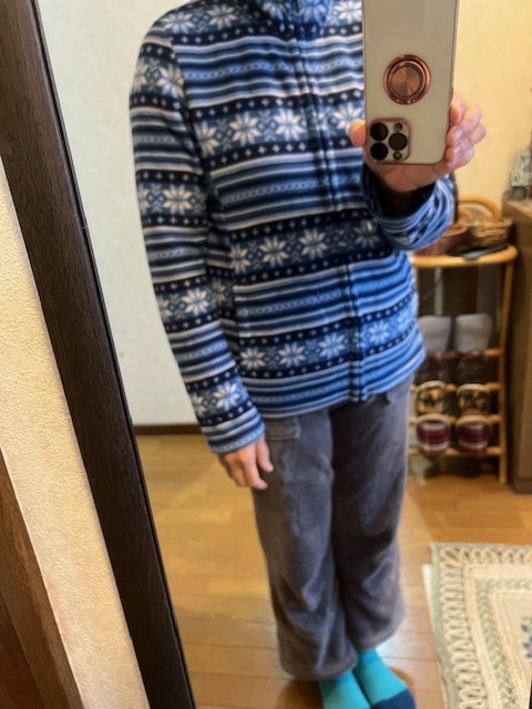 紺・青・水色・白のフリースジャンバー、グレーのフリースパンツ。