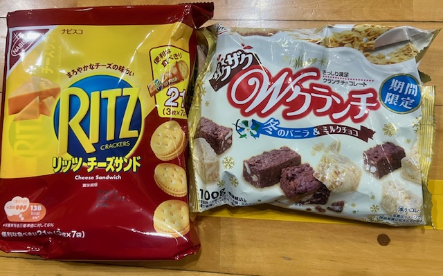 リッツ・チーズサンド、ザクザクWクランチチョコ。