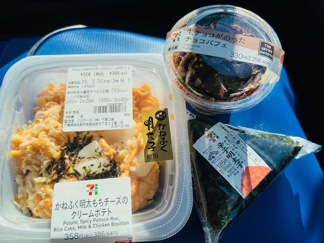 昼食・おやつを購入。辛子明太子おにぎり、かねふく明太もちチーズのクリームポテト、生チョコがのったチョコパフェ。