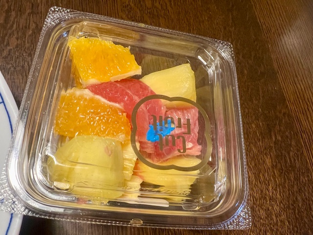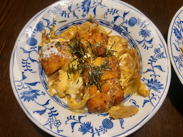 夕食は、海老カツ卵とじ・刻みのリ、コールスローサラダ(キャベツ・胡瓜・ミニトマト・カニカマ)、小松菜の味噌汁、カットフルーツ。
