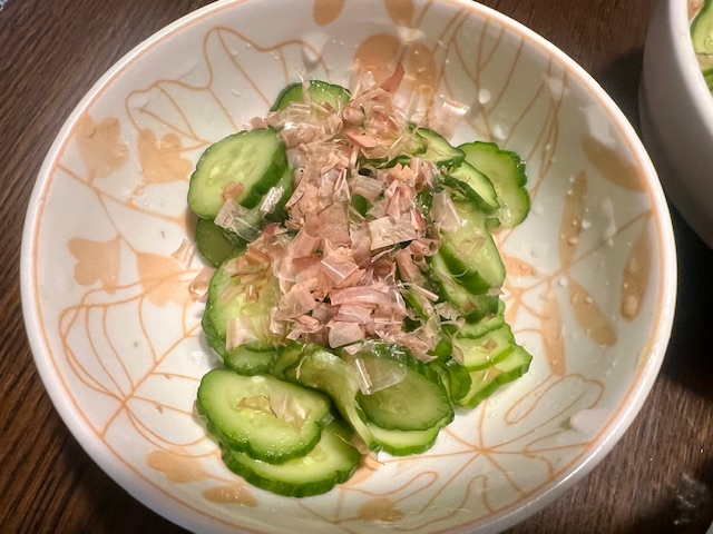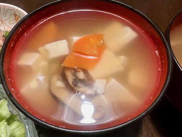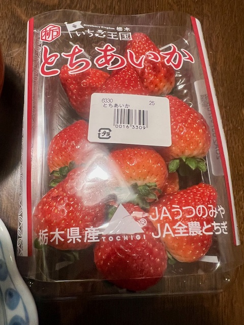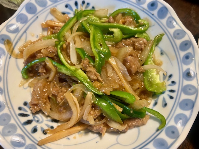 夕食は、青椒肉絲、レタス、胡瓜・鰹節、豆腐・椎茸・人参の中華スープ、苺・とちあいか。