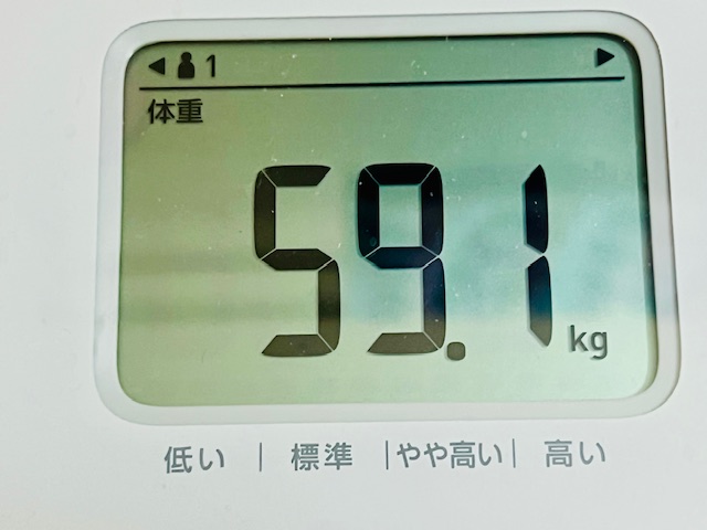 体重は、夕食後・入浴前59.1kg。2日前から0.7kg増えた、、、