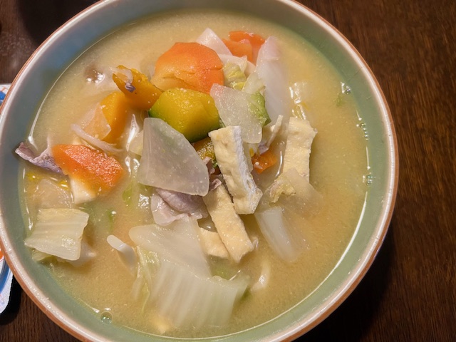 夕食は、ほうとう・豚・南瓜・人参・大根・白菜・油揚げ。帆立・油揚げ・人参・昆布煮、蒟蒻・人参・枝豆・ひじき煮、みかん。