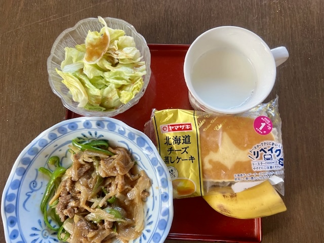 朝食は、青椒肉絲、北海道チーズ蒸しケーキ、レタス・ドレッシング、牛乳。