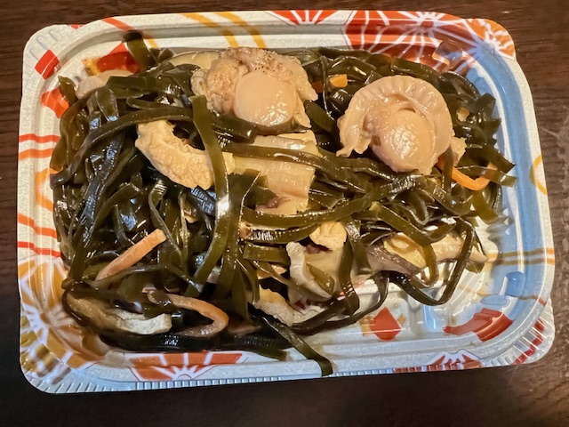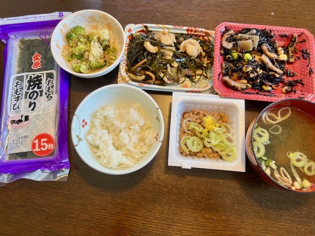 昼食は、納豆・ネギ、焼海苔、帆立・油揚げ・人参・昆布煮、蒟蒻・人参・枝豆・ひじき煮、ブロッコリーの胡麻和え、麩・ネギの味噌汁、ご飯。