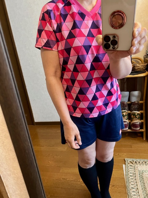 卓球には、ピンク・紫の卓球ユニフォーム、紺・ピンクのキュロット、黒のハイソックス、茶のムートンブーツ。