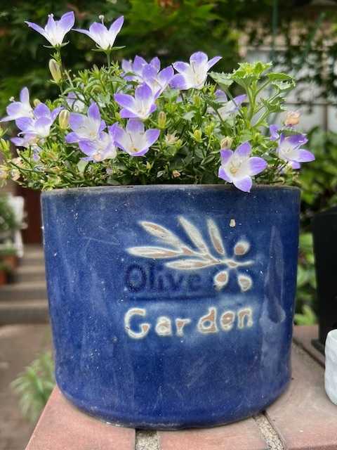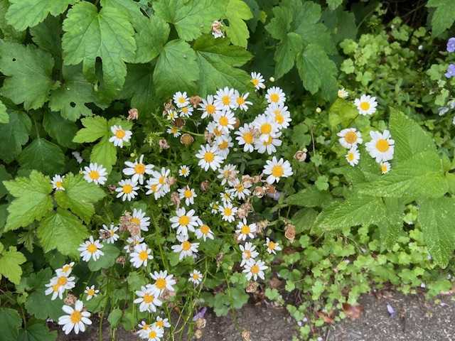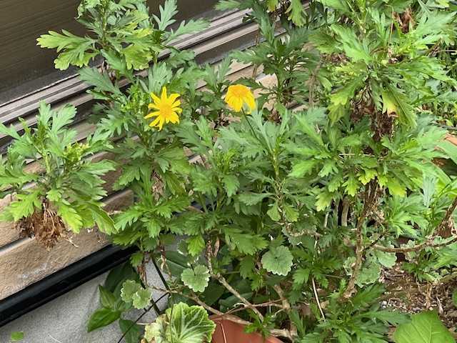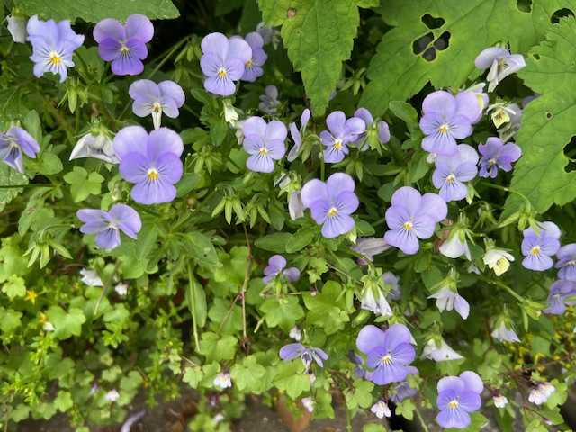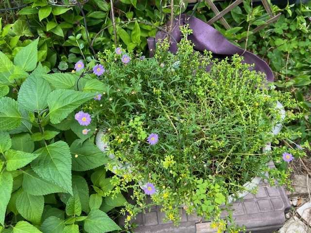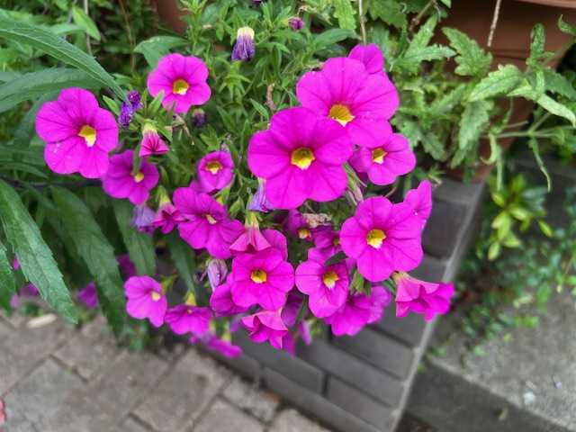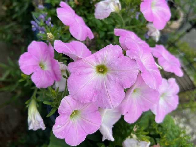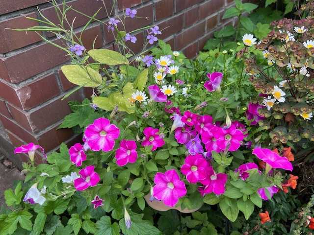 寄せ植え。ペチュニア・ハッピーシャワー、ノースポール、紫花菜など。