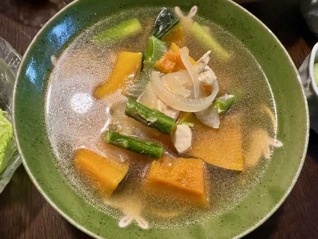 夕食は、メカジキのチーズ焼き・パセリ、鶏・南瓜・玉ねぎ・アスパラのコンソメ煮、サニーレタス、胡瓜のマリネ、椎茸の味噌汁、青玉メロン・イバラキング(茨木県鉾田産)。