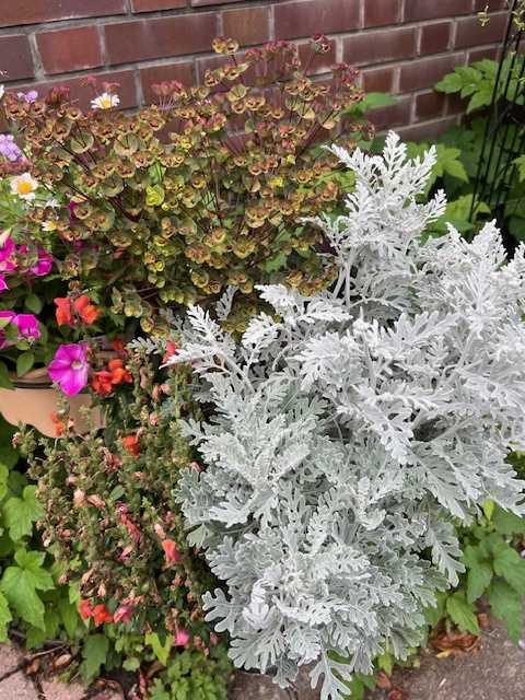 寄せ植え。ユーフォルビア・ブラックバード、白妙菊、金魚草。
