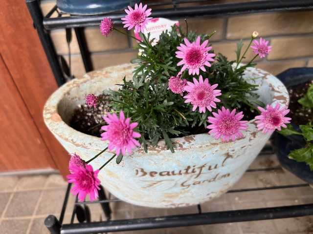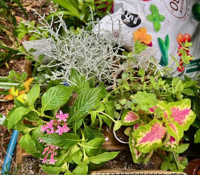 つい花苗も買ってしまった。スリットハンギングだと花数が要るしね。