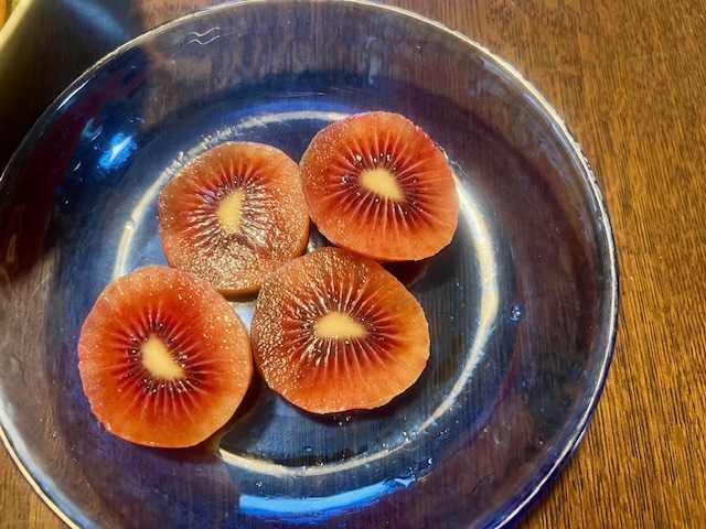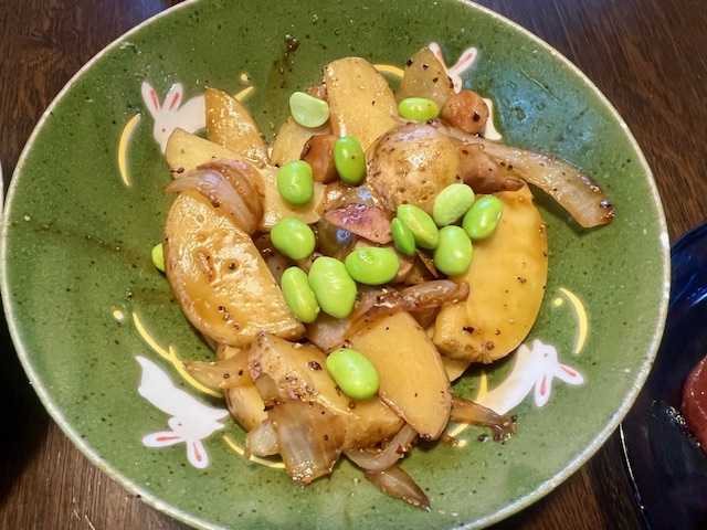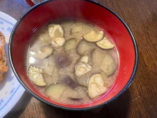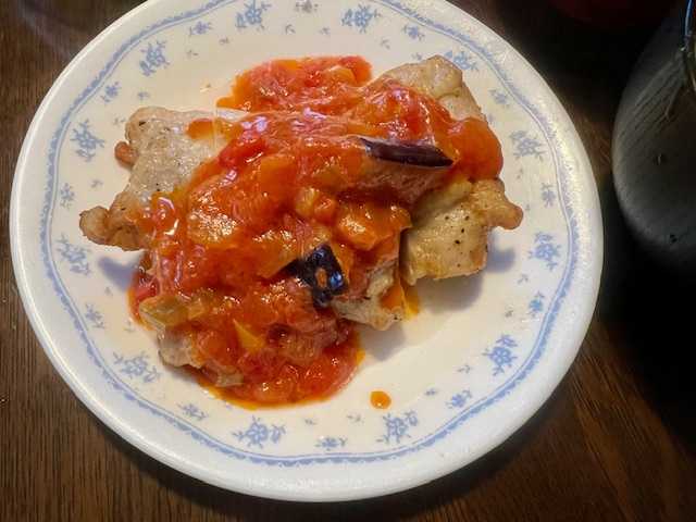 夕食は、グリルチキンの彩りトマトソース(赤ピーマン・黄ピーマン・茄子)、ウィンナー・じゃがいも・玉ねぎ・枝豆の粒マスタード炒め、サニーレタス、茄子の味噌汁、レッドキウイ。