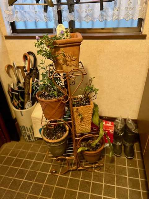 玄関内の鉢ラック。本来はリビングなどの室内用なのですが、夫の反対で玄関に。うちの玄関は暖気が来ないから、冬越えできるかな。目隠しに、クリスマスの包装紙。少しはクリスマス気分?wKさんにもらった月下美人です。切り戻したし、花は咲きそうにないけど、冬越しできるかな?スーパートレニア・カタリーナ・ブルーウェーブ。毎年購入するのですが、今年は、冬越し出来るといいなあ。いつもは戸外なので、枯れますw