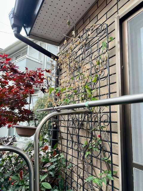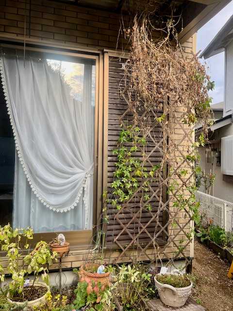 もみじ葉朝顔・チロリアンランプの枯れ枝を取り除いた。両方共、伸びすぎたので、夫が切ったのですが、そのまま放置だったので、枯れ枝などを取り除きました。踏み台だけでは届かず、脚立も出しました。最初、脚立の金具が固くて引けず、諦めて梯子みたいに立てかけようとしたが、雨戸なので危ない。なんとか力を込めて引いたら出来たので、脚立になり、乗って出来ました。もみじ葉朝顔は2階のベランダまで這いあがり、エアコンの室外機にまで入り込んでたそう。ベランダの下に、まだ生き残ってたもみじ葉あさがおを発見!壁のレンガのパネルの裏側に入り込んでたらしい。どこから入り込んだのかわからず、上だけ取った。クレマチスも一緒に這わせてたので、それも一緒に夫に切られてしまったけど、この頃上の方でしか咲かなかったから、まあいいかな。でも旧枝咲きだから、来年咲くかな・・・