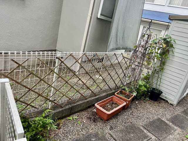 フェンスの内側に木のラティス。伸縮性なので下に落ちてたが、緑の洗濯ばさみみたいなので、留め直した。