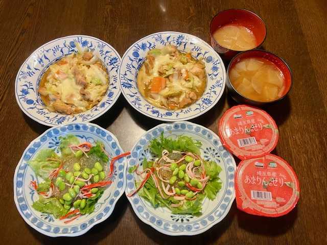 今日の夕食は、チーズダッカルビ、春雨サラダ、大根の味噌汁、あまりんゼリー、みかんのマーマレード。