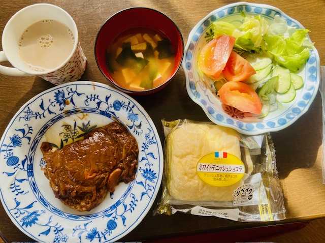 今日の昼食。昨日の日記が、今朝7時頃までかかってしまい、それから寝たら、12時頃起きたのです。でも、睡眠不足だなあ。その日の日記は、その日のうちに、書き上げてるのですが、翌日ならぬ、翌朝までになってしまった。流石に7時は新記録でした。体調不良の一因は、睡眠不足かも。まあ、食べられないのも、あるけどね。昨夜の夕食が、まるまる残ってるので、食べきれない。少し食べてから、夫に炒め物、味噌汁はあげ、サラダとカフェオレだけ食べました。