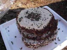 今日は 仕事場の友達の お兄ちゃんの家の方で おもしろいイベントがある って 誘ってくれたので またまた お出かけです友達のお兄ちゃんは 山奥の陶房で 作陶をしていますその 山でのおもしろいイベントそれは 「ハチサミット」 でした 注:心臓の弱い人は見ないほうがいいかも。。。。。 ハチの品評会ですで、即売もしています。。。1キロで 1万円ぐらいらしい。。。で、だいたい 一つの巣で 2キロ前後。。。巣の中から 芋虫みたいなやつを穿り出して。。。 ご飯に炊く。。とか 焼いて食べるとか。。。でも お値段からすれば かなりの高級品ですぞけど。。。私は アカン これは ハチを焼酎で漬けてある。。。らしい「ねえちゃん これ飲んで寝れば よう寝れるに~」ねえちゃんは。。。そんなもん飲まなくても よう眠れますだ。。。 へぼだれの五平餅(へぼ=ハチの子)なんか へぼを擦って 五平餅のたれに混ぜて。。。でも これが なかなか美味らしく。。。1時間待ちなんだよで、結局 私 一口だけ 食べてしまったあ~生まれて初めてのへぼ。。。この五平餅は 炭火で焼いてて 匂いがたまらんかった←言い訳でも やっぱり へぼ かと思うと どうしても食が進まん・・・(でも 美味しいョ。。。。) ここを見てから お兄ちゃんの家で 近所の人たちや友達とごちゃ混ぜで バーベキュー。。飲み会。。宴会がありましていろいろ ここでも珍しいもの いただきましたごちそうさま でした~ そういえば。。。追加宴会で一緒だった 近所のおじさん の ペットのようなハチ指に止まってるヤツ おじさんは ヤッケのポケットに入れて連れてきましたが、その後 バーべキューの網の上で焼かれましたすごいすごすぎる 今日は 激寒かったです道中 山の中は 気温3℃でしたでも 山々の紅葉は メチャきれいだったですよ