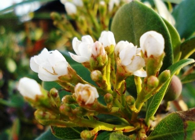 近所の車輪梅の花と実で、花は遅れ花のようだ。バラ科シャリンバイ属の常緑樹で5月ごろ梅の花に似た白い花が咲き始め、秋から冬にかけてブルーベリーに良く似た黒紫色の実がなる。別名ハナモッコク(花木斛)と云う。