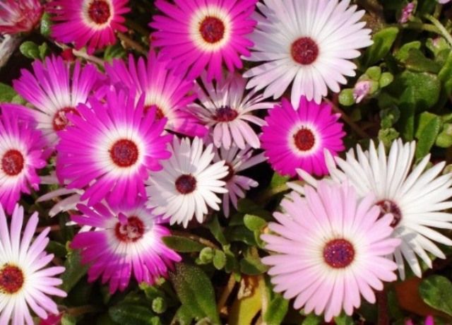 リビングストンデージーの花が咲いて、何処の庭も賑やかになっている。ツルナ科ドロセアンサス属の1年草で、花色はピンク色、紅色、橙色、黄色などで、花の中心に蛇の目が入っている。草丈はあまり高くならずに横に這うようにして延びるのでグラウンドカバーに良いですね。別名ベニハリソウ(紅玻璃草)と云う。