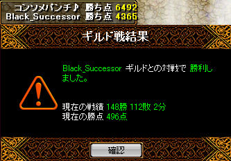 どうもお久しぶりです。風邪も完全に治って、だいぶ落ち着いてきました。SSもたまってるので今回は長いですよー。まずは戦績から。コンソメでのGv。1戦目 ~Infinitia~さんがお相手でした。久しぶりの対戦ですね。PTは3PT、しかしwizBISが各2名ずつという厳しい状況に。最初の衝突で、いきなり5000点近くとられて苦しい状況になります。1回ひいて落ち着いてから、再度戦闘開始です。逆転に成功したところですね。しかし、負けてて追われてる状況のSSがなぜないのかというと、必死すぎて撮る状況じゃないってやつですはい・・・w相手のBISさんを倒すことができたため、ここを起点にしてリードをじわじわ広げていくことにしました。しかし逆転してリードが広がってくると、コンソメの悪い癖が出始めて、徐々に単体でつっこんでいってやられていくように・・・。かなり差のない状況になってしまったため、一気にひいて逃げ切りを図りましたが、時すでに遅し。その勢いのまま逆転され判定敗北。支援が少なかったこともありましたが、それ以上にその日は厳しく反省会しました。でもいい薬になったんじゃないかとおもいますね~。対戦ありがとうございました。2戦目 ∈NeoGion∋さんがお相手でした。もうかなりの数やってますね~。ホムペの戦績を、対戦相手別にソートしてみたらなんとこれが11戦目。それまでの戦績は3勝7敗・・・かなり分が悪いです。内容の濃いGvでしたので、SSも多くぺたぺた。集まりは26人で、最初は4PTで組むことにしました。支援陣は前回と変わってかなり良好、しかしPTの数も4になったためそれでも厳しい感じは否めないですが。最初の衝突で、2000対8000ほどで大きくリードを許してしまいます。一旦大きく引いて、PT編成をしなおし立て直すことに。3PT+ペアに変更しました。その後、一気に追い上げムードとなり点数を加算していきます。逆転に成功したところです。このままいけば楽だったのですが・・・、またしても再逆転されます。しっかしそれにしても何も見えませんね^^この後、まとまって戦うということをあえてしないで、BIS天使さんのコルに任せた戦い方をしていき、お互いマップを広く使った戦いになりました。判定勝利でした。感想としては、テス鯖の紅白戦みたいな内容、重さでしたね。お互いPTのBISさんが落ちると大量得失点だったんじゃないですかね・・・。でも戦争、って感じはしましたね。対戦ありがとうございました。お次はマリオのGv~。お相手はえのちゃんと愉快な仲間さんでした。SSは結果のみ。どうやらBISさんがいなかったようですね。全滅勝利でした。対戦ありがとうございました。さて、タイトルの内容1個目です。石像作り頑張ってましたが・・・ついに!!!こいつを作って・・・!完成しましたぁ(*´∀`)さっそくLv2をどんどん作っていこう~ってことになってます。みんなで頑張っていきましょう~!さて、次は真面目な話題。ソロ狩場、について思うことです。今回は完全な主観で書くので、考え方が合わない人もいらっしゃると思いますが、そーゆー考え方もあるのか・・・って感じで一つの意見と思ってくれればうれしいです。まず大体、ソロ狩場なんて明確な基準はないと思ってるんですよね・・・w逆に言えば、PT狩場、なんてものもないと思ってます。でも区別があるのは、そこは暗黙のルール・・・に従ってるからですね。どっちが優先なんてこたーないんです、意見が多いほうが通用する世界ですwで、ここではそのソロ狩場のお話。人気のソロ狩場っていうと、モリネルだったりトランだったりしますね。よく狩り場争い・・・などありますね。狩場で言い争いになったりだとかもありますが。確かに、いい狩場を使ってて、とられるのは嫌ですよね!それはなんかえらそーなこと言ってる私も同じですし・・・そうじゃない人はいないと思います。でも、感情と自分の都合だけで行動するのは・・・いかがなもんでしょーかね。例えばリアルのこと置き換えればいいんですよ。狩場を・・・大学にある少ないテニスコートにでもしましょうか。でもテニスサークルの数はいっぱいあって、もしこれが早い者勝ちだったとしましょうか・・・。そうすると、例えば誰かがそこを使ってたら、無理やり割り込んでやろうとなんて普通しませんよねwまた、そこに誰もいないのにラケットだけが放置してあったら、ラケットどかしてコート使う人もいれば、ラケットあるからなんか言われるの嫌だなぁ・・・って思う人もいるかもしんないです。もしどかして使って、持ち主が戻ってきた場合、いきなりケンカにならないでしょう普通の人同士なら・・・wずっと長時間使ってる人がいたら、ちょっと社交的な人なら、仲良くなって交代で使うだとか、するでしょうし。使い終わったら連絡してもらえませんか?とか、言う人だっているでしょうし。ちなみにこれ全部想像の話ですwまー何が言いたいかって言うと、せっかくMMOなんですから会話を交わせば、問題も