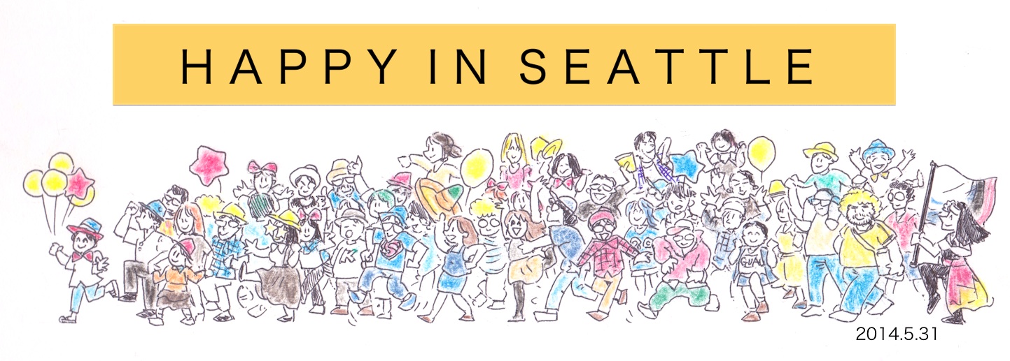 世界中でたくさんの人が動画制作をしてYouTubeにアップしている Pharrell Williams の「HAPPY」『バイリンガール英会話』のChikaさんプロデュースで5月31日に『HAPPY IN SEATTLE』が撮影されました。それをイラストにしてみました。参加者の中に自分に雰囲気がそっくりな人がいて、ビックリすると同時に笑ってしまいました!