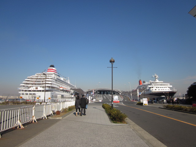 週末、横浜に行きました。たまたまですが、横浜港の大桟橋に2隻の客船が入港していました。『飛鳥2』と『にっぽん丸』どちらもかなり大きく、並んでいる姿は壮観です!新しく出来た大桟橋は、愛称を「くじらのせなか」と言うそうですが、とてもユニークで流れるような美しいデザインでした。追記:「新しく」と書きましたが竣工は2002年で、もう10年以上経ってるんですね。