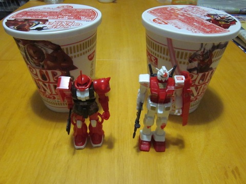 日清カップヌードル40周年記念で発売された『カップ・ガンプラ』1/200のガンダムとシャア専用ザク。ほっときっぱなしだったものを組み立ててみました。ガンダムが9センチで、ザクが8.95センチ。デザインは両方ともカップヌードル、オリジナルデザイン版。『ガンプラ』なるものを初めて作りましたが、小さいくせに、結構良く出来てるんで、ちょっと驚き首や肩、足の付け根、足首が稼働します。ちょっとしたバトル・シーンも…ひじとひざが稼働すれば言うこと無かったんだけどな~。