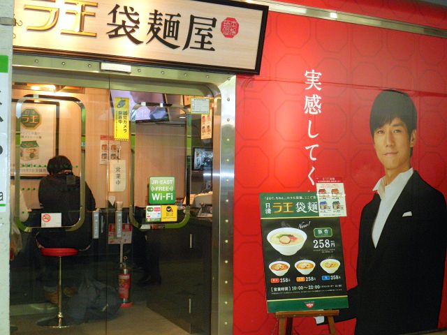 以前からずっと、一度は食べてみたかったJR渋谷駅内回り線ホームにある『ラ王袋麺屋』に、念願かなっていって参りました!メニューはラ王の醤油、みそ、塩、豚骨の4種のみ。厨房では注文を受けると、あの袋麺を開けて作り始めます。混み具合にもよりますが、待つ事5〜10分。チャーシュー、煮たまご、メンマ、カイワレをトッピングした、ラ王が…(因に塩を注文しました)見栄え、味とも、258円には充分すぎるクオリティ! 満足です!