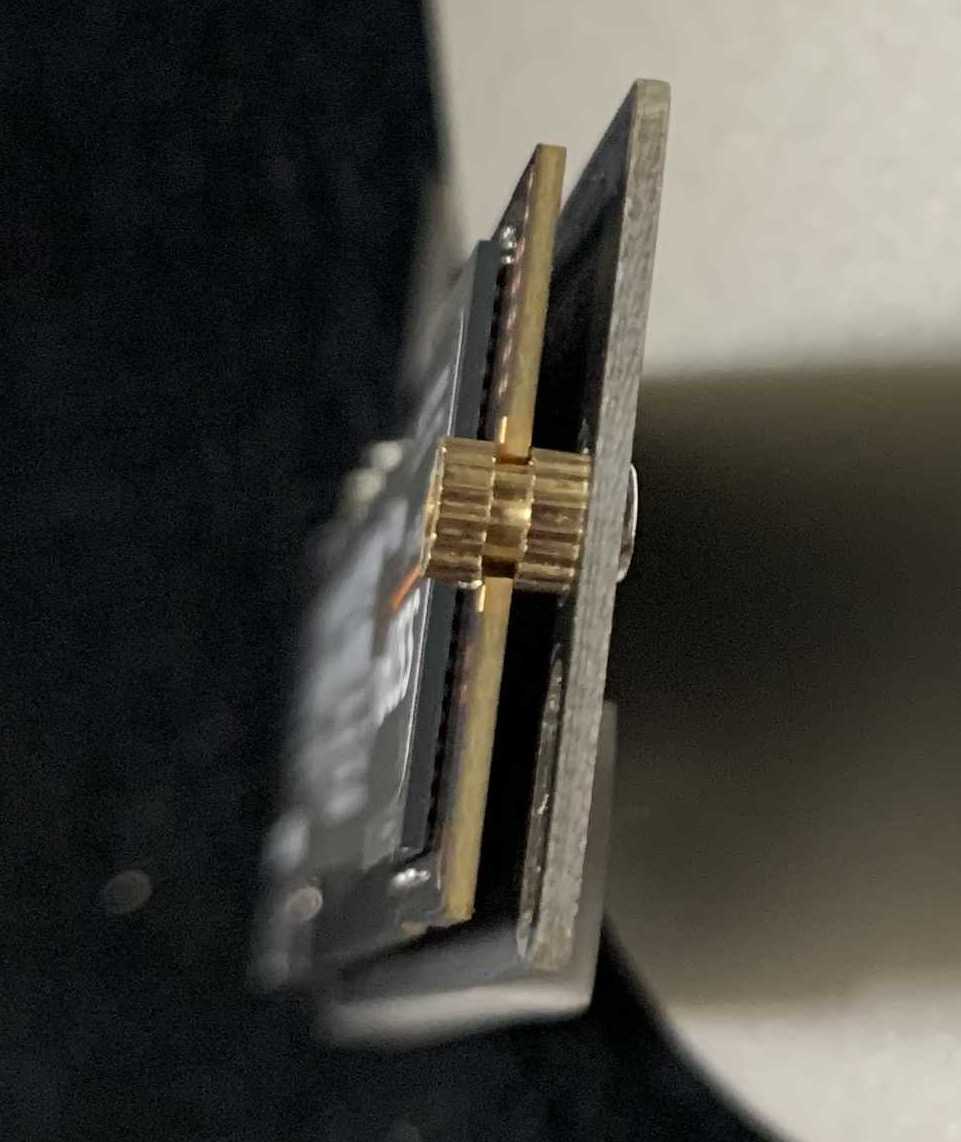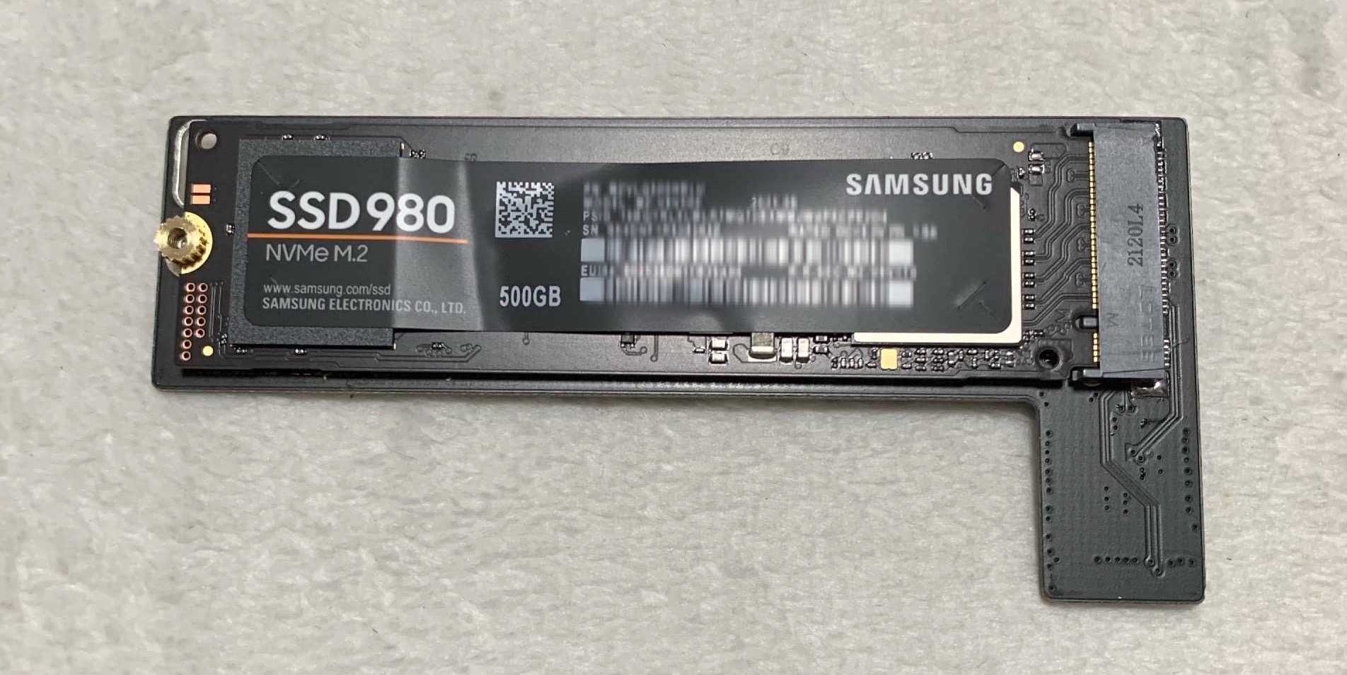ここで、変換アダプターとSSDを組んでおきます。変換アダプターに付属の金色の台座にSSDの窪み部分を合わせ裏からビスで固定します。