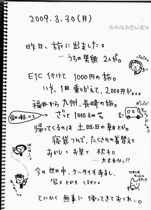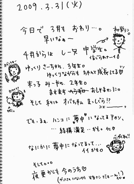 ↑コレ、朝早く書いた日記デス。カメラ持ってっちゃったからスキャナで。つまんない~*昨日の夜、7時半頃に出て、夜は7時間ほど寝て、先ほど4時前に関門橋渡る、と電話が。写メ 見たけど、九州って結構近かった~!!私も行きたかったなぁ~ |扉|・ω・`*)b ェェナァ-♪ってわけで。今は、女3人+メス1匹。まったくの男っ気なし、女ワールドです~。昨日の夜、3人でお風呂入ってて、近所のうちの車のドアを閉める音にかなりビクついた私。← かなりの怖がり。Σ(・ω・ノ)ノ古い家なもんで、音まる聞こえ。( ̄ー ̄; ←え?今更??こんな夜が あと…×4回!? (ー'`ー;)ムムッ一人暮らししたかった~なんて、どの口が言ってたのか。。。***今日彫ったはんこ。最近、ショートボブっぽい子をよく描きます。…私が ショートボブにしたから。(。-∀-)エヘ♪あと1つあるけど、それはまた今度。。。春休みに合わせて パートを休んでいる私。子供たちもセットで児童館へ遊びに行ってるこの時間。。。はんこ彫ってー ブログしてー サイコ━+゚*。:゚+(人*´∀`)+゚:。*゚+.━━!!…3食作るのはめんどいけど~*あっ 壁|ω-o) ニュウガクジュンビ…間に合うように するでありますっ (-ω-ゞぁぃ。