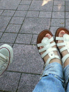 がっこに行ったらオープンキャンパスでした。人がいないがっこを想像していったのでちょっと残念。高校生もたくさんいたけど、大学が系列の小学校を来年開校するのでその説明会も同時に行われてたみたいで親子連れもいるし。ちょっと変な感じ。休みで人がまばらながっこって好きなのになー。実習室に行って、勉強してたら先生たちはなにやら忙しそう。そうだ、3回生は実習だもんね。実習始まったんだよねー。去年は私たちだったんだよなー。もう1年か。去年は7月31日までがっつり試験して、で、8月2日には実習入ってたから息つくひままかったもんなぁ。実習は大変だったけど、実習行かなきゃこの学部に入った意味が半分もなかったんだろうなぁと思います。言葉で学んでも、自分自身で感じないとこの学部の勉強は絶対わからない。たった1ヶ月だけど。知らないことを知ることができた。忘れないでいたい。友達とベンチに座ってパシャ。サンダル愛用中です。すごい履き心地良し。やわらかくてずっと履いてたいと思っちゃう。お気に入りのサンダル履いて、この夏はいろんなところに行く予定。