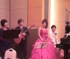先週&今週末と連続で結婚式でした。先週の土曜日は東京時代の音楽仲間・めぞん君の結婚式~横浜で行われました~写真赤いドレスが奥様、白いタキシードがめぞん君。結婚式ではらいおんはーと他3曲を奥様が横で見守る中めぞん君はバンドメンバーとして演奏されました。それにしても、めぞん君結婚式&2次会を通してずっとガチガチでした(笑)入場の時「はよ進めよ!」とツッコミが入るくらい(笑)まあ、彼らしいですけどね(^^)そして今週土曜日はTOPNOTEやfannyyでお世話になったあたさん&なっちゃんの結婚パーティーへ~ユニット「Algente」でバイオリンを弾く新婦・なっちゃんとベースを弾く新郎・あたさん。この日はあたさんのバンド仲間がユニットやバンドを組んで演奏するのがメインだったので私もベース弾かせて頂きました~。特に今回は「いきなりTOPNOTE」という練習たった1回(!)という無謀な挑戦でしたが、会場の皆様楽しんでいただけたようでうれしかったです。特にVo.みずほちゃんは人生初のライブでかなり緊張していましたが、見事歌いきってくれました!よくがんばりました。めぞんくん&あたさん&なっちゃん本当におめでとう!末永くお幸せに~そしてこれからも一緒に音だそうね~(^^)/