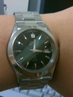 学生時代はずっとSWATCHの時計をしていましたが、携帯電話を持つようになって以来、元々腕時計の締め付けられ感が嫌いな私は腕時計をしなくなりました。ところが今回のクリスマス、とある人と「お互いに似合うと思う腕時計をプレゼント交換しよう」という話になり、↓の時計を頂きました。スイスミリタリーのエレガント!緑色の文字盤ってなかなかないので、とってもおしゃれな感じで気に入っています(^^)このデザインなら仕事でもプライベートでもつけれますね。プレゼントしていただいた人も「同じものを買おうかと思ったくらい!」とのこと(笑)明日から早速会社にしていきたいと思います♪