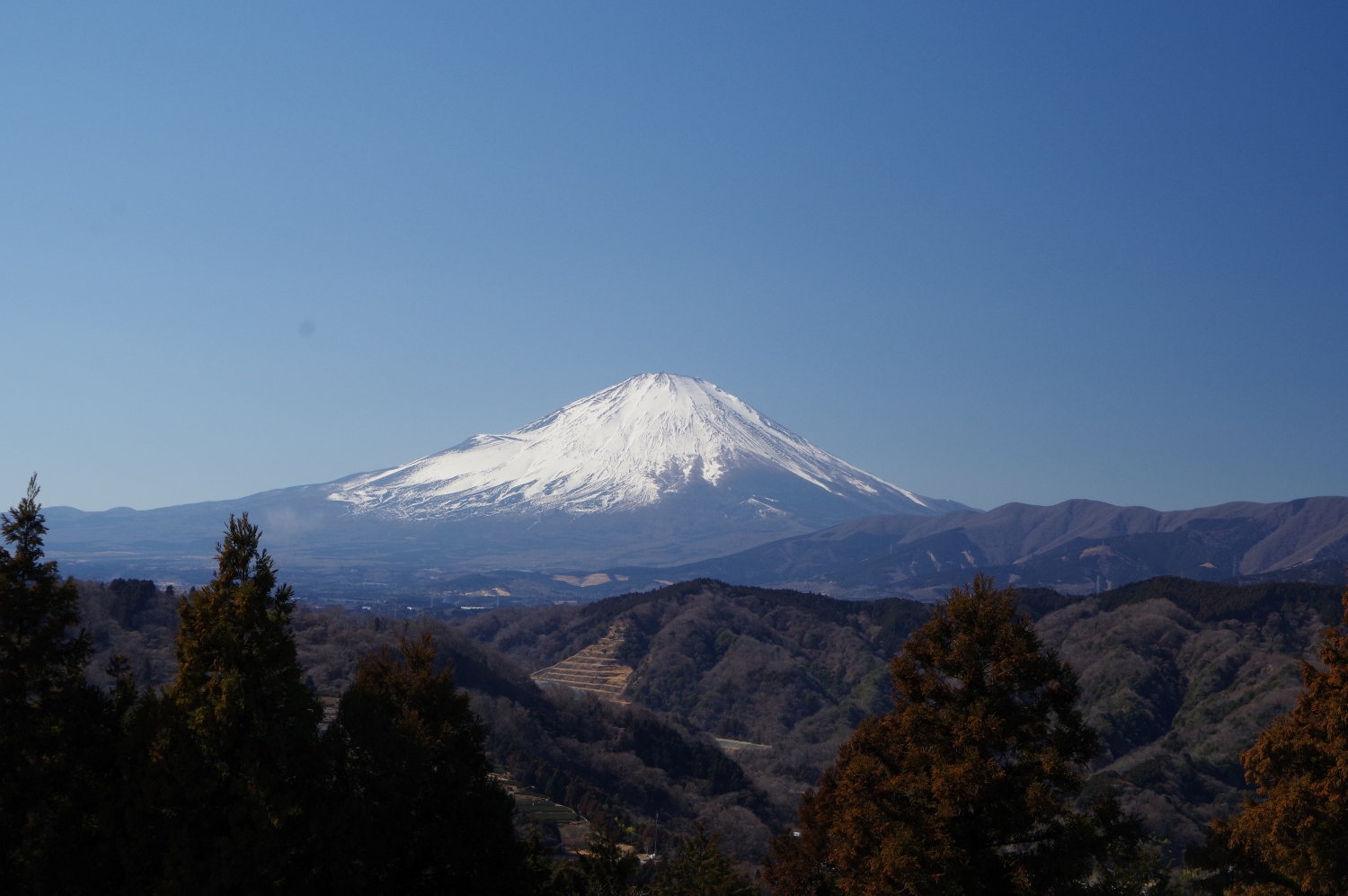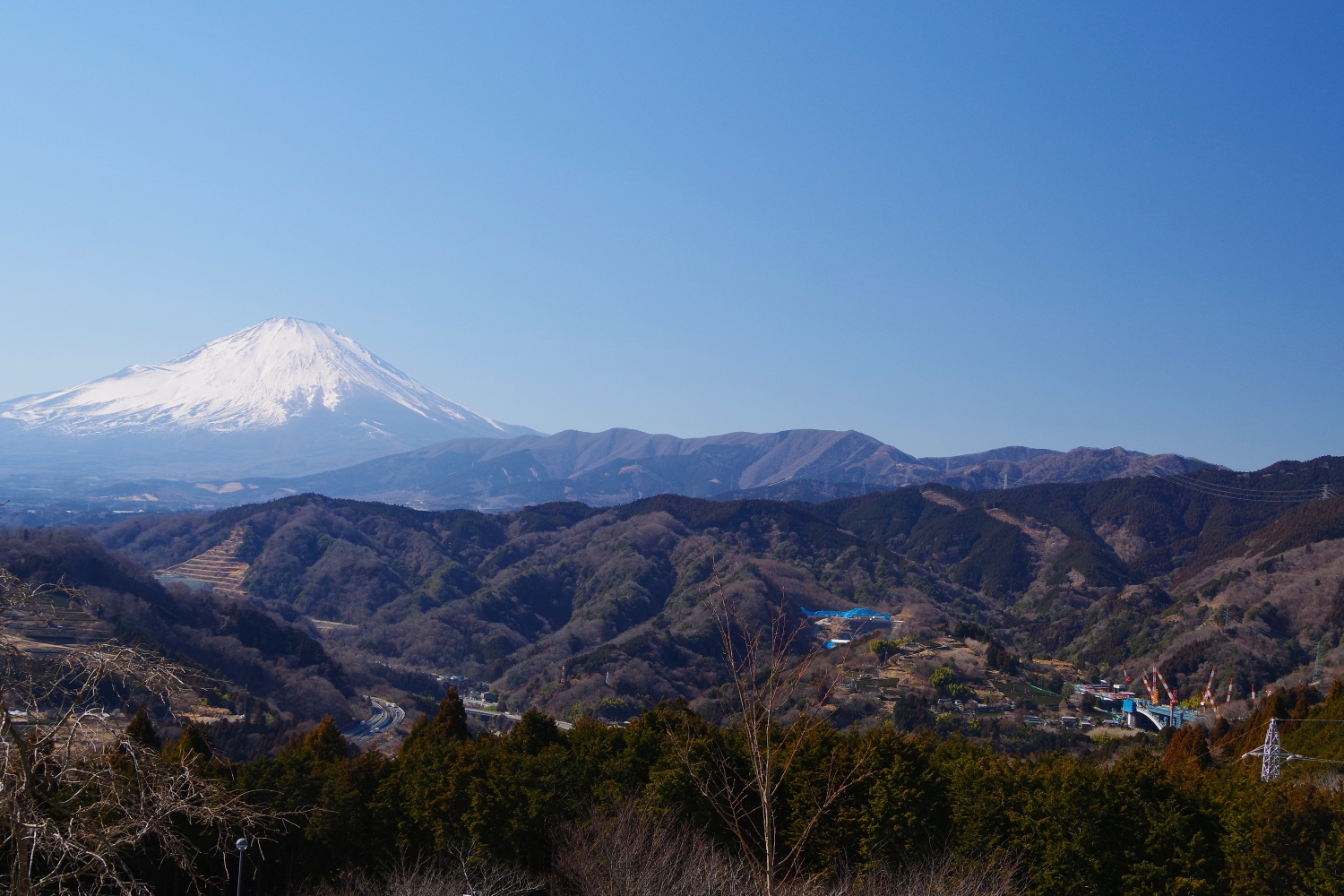 この橋を山の上から撮れないかと近くの大野山に向かいました。途中に「つぶらの公園」があり向かうと、なんと富士の絶景が! 今日は富士を目的に来たのではありませんよ。
