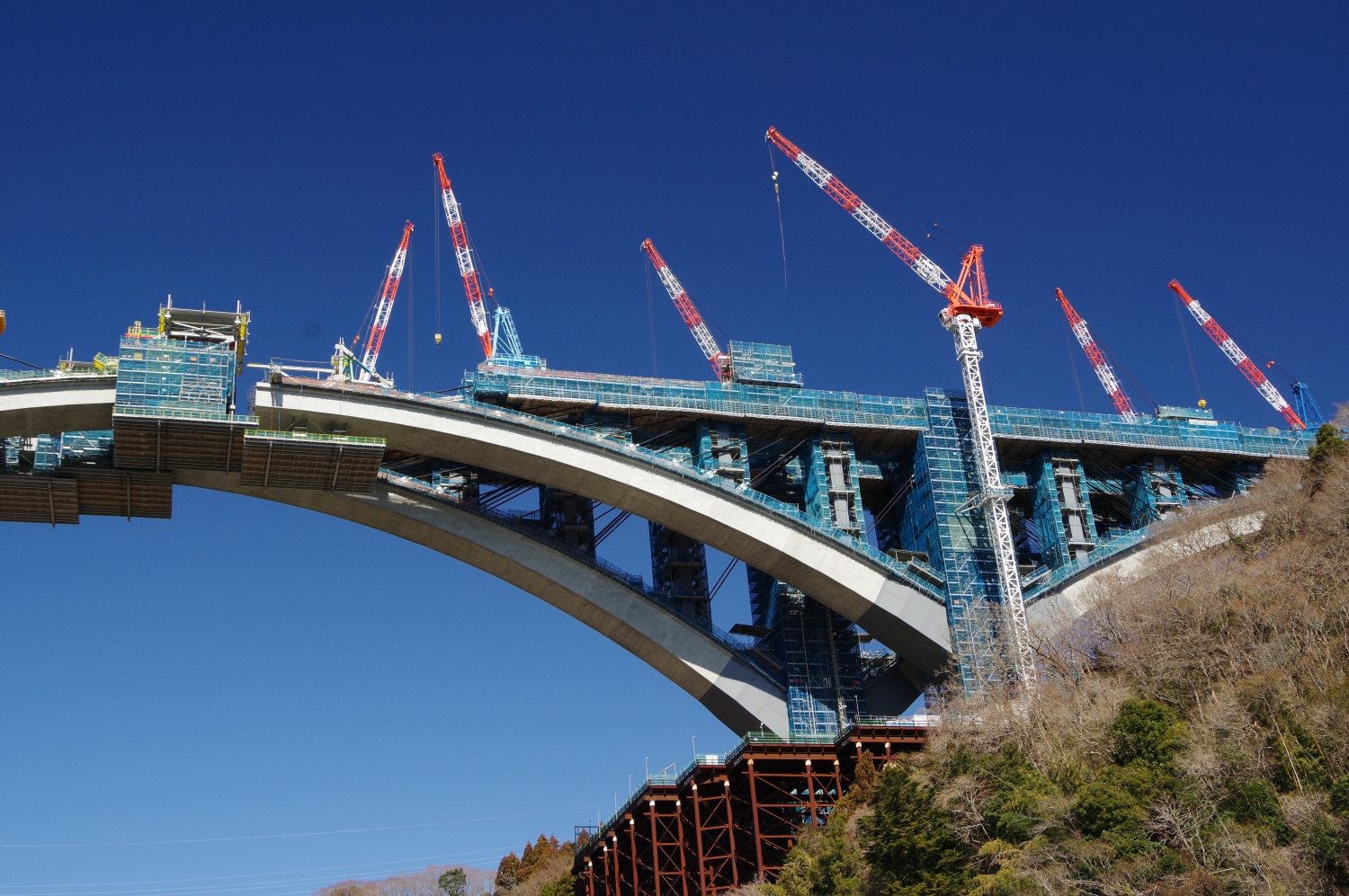 橋の両側は山間部で、トンネル工事も同時に行われている大工事です