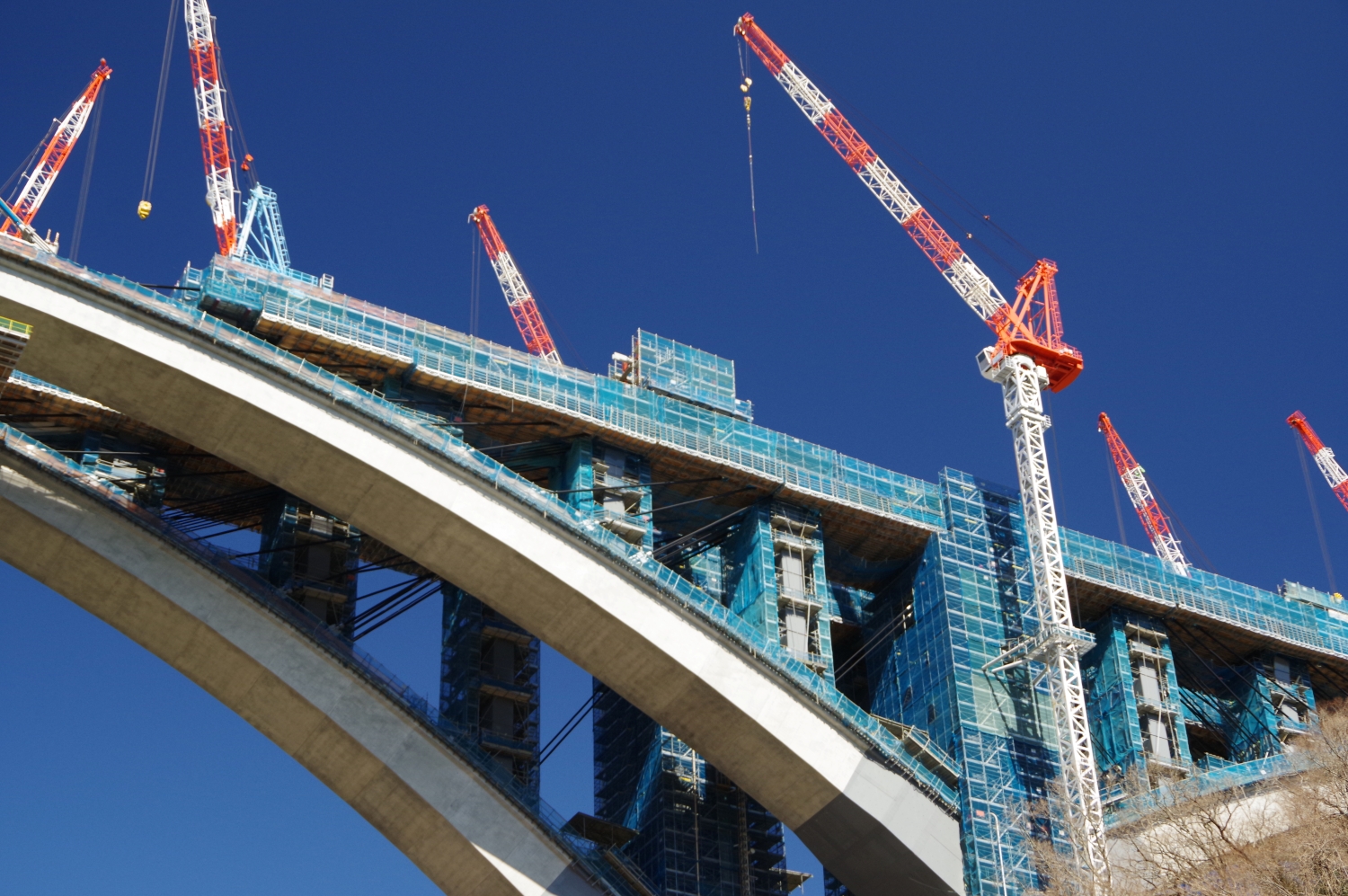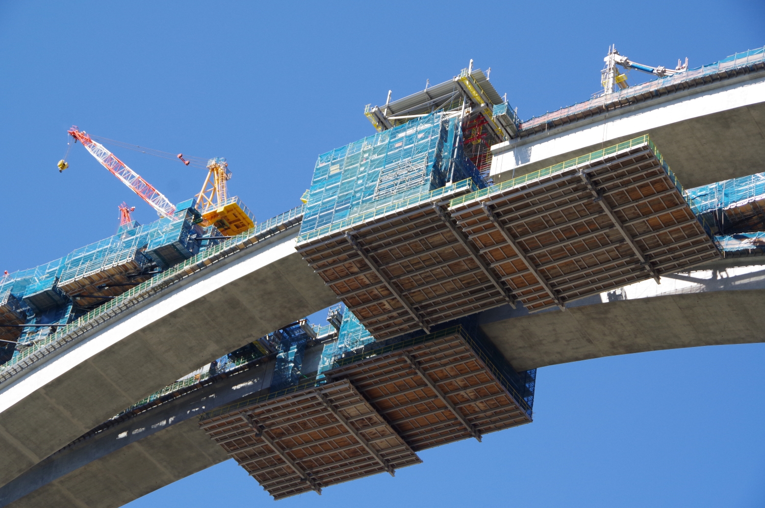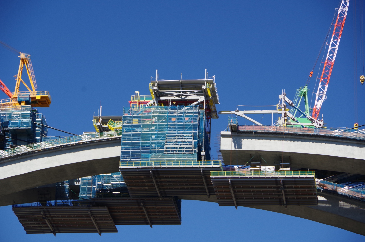 両側からせり出したアーチが橋の中央で、まもなくドッキングしようとしています。