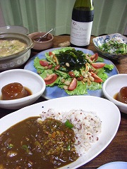 今日は、陽が出てきた。洗濯物、乾かしたいよね・・・・あちこちで、運動会の季節。週末も、不安定な天気と予報が! お天気になるといいね。おとといの、夕飯になるのかな・・・夕食メニューです。・野菜カレー&押し麦と赤米入りのご飯・もろこと野菜の卵とじ・ワカメと、おまめの野菜サラダ・大根の味噌田楽(今日は、ゆず味噌を乗せてます)・キャベツと梅酢茗荷の箸やすめ香辛料や、スパイスをたっぷり入れて。我が家は、ピーマンが好きなので・・・最後に、ピーマンを入れて火を止めます。香りと色、シャキシャキ感を楽しみます!カレーのご飯に、麦を入れると美味しいよ。パラリとしたご飯と、カレーのなじみがいいんだ。◆作り方はこちら 野菜カレーは、ピーマンが決め手! by FELLOWもろこ鍋の翌日は、スープにしたが・・・・残ったスープには、コラーゲンが一杯だし!スープが、トロトロしてるんだよね。これは、無駄なく摂取しなくては野菜をたっぷり入れて、卵とじ。コラーゲン、残さず完食。大豆・青えんどう豆・金時豆を乗せて野菜にワカメもたっぷり。ワカメは、動脈硬化を防止する働きもあるよ。豆類は、良質のたんぱく質。大豆・青えんどう豆は、ビタミンB1も多い。金時豆は、カルシウムが豊富なんだよ!いっぱい食べようね。ゆず胡椒を加えた、ドレッシングで頂きます。ざく切りキャベツを塩もみ。良く絞って、梅酢茗荷の千切りを加えます。ゴマと、シラスもたっぷりのせて。さっぱりした、箸休めになりました。梅酢茗荷がの代わりに、梅干のたたきでも美味しいよ。今夜のワインはこれ。ドメーヌ・ダニエル・エ・ドゥニ・アラリー・ラ・グランジュ・ダニエル 2004このワインは、5本組みお買い得の中の1本。思ったより、軽いワインだった。デキャンタした方が良かったかな?・・・とも思ったけど、開きも早いみたい。それなりに、バランスのあるワインでした。ある意味、お料理の邪魔をしない・・・料理に合わせ易いワインともいえるかも。今日も、幸せ~ な時間ありがとうです。参加しました・・・宜かったらクリックしてくださいね(^^ゞ ◆HOME ◆BBS日記 ◆本日のワイン ◆旅行 ◆ウォーキング ◆食器 ◆家作り ◆カテゴリ未分類 ◆我が家のグリーン ◆料理レシピ ◆スイーツ ◆美味しい店