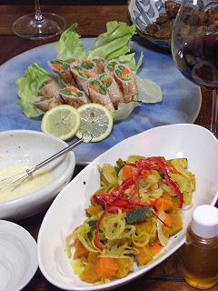 台風14号、このままだと関東上陸?夕食メニューです。・野菜の豚巻き・かぼちゃサラダ・アンチョビとナスのパスタ◆作り方はこちら かぼちゃサラダ by FELLOWかぼちゃのβカロチンは、皮やワタに多い。皮は、剥かないで食べようね。にんじんのカロチンの吸収率。生10%、茹で30%油等を使うと50%~70%。今回は『アルガンオイル』を使用。詳しくは、こちらアルガンオイル高級レストラン、自然派のバージンオイルと注目です。『アルガンオイル』は、モロッコのアルガンツリーの果実で作られます。地球の温暖化、乾燥化が進むサハラ砂漠。砂漠が地中海へ北上するのを阻止!!この、バリア機能がアルガンツリーなの。モニターに応募したら当選しました。コレステロールの低下・血液サラサラ・老化防止・癌の予防ビタミンEはオリーブオイルの2~3倍等早速、サラダに掛けてみる。ナッツをローストしたような、香ばしい香り。かぼちゃや人参が、さらに濃厚な味になりました。香りも楽しみながら、サラダがグレードUP。彩りがいいと、食も進むよ。作り方も簡単。お弁当にもいいでしょ。冷蔵庫に、何が残ってるかな?レタス巻いたり、ピーマン・玉葱・・・イロイロ試して、冷蔵庫も片付けてね。◆作り方はこちら 彩り野菜を豚肉で巻き巻き by FELLOW 塩加減もいいし・・・・24時間以内の加工で色も鮮やか。再購入です今日のワインはこれ。ローズマウント・セラー・セレクション・シラーズ・カベルネ 2004グラスに、注ぐとプラムや、ベリーの香り。やっぱりフルーティな味わい。今日の、かぼちゃや、さっぱりした野菜巻きにはいい感じ。参加しました・・・宜かったらクリックしてくださいね ◆HOME ◆BBS日記 ◆本日のワイン ◆旅行 ◆ウォーキング ◆食器 ◆家作り ◆カテゴリ未分類 ◆我が家のグリーン ◆料理レシピ ◆スイーツ ◆美味しい店