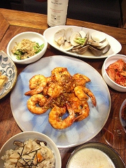 本日は、ハマグリ三昧! 贅沢な使い方だね料理日記がしばらく続きます! 日曜が、ダーリンの店のイベントでした。家にたどり着いて、クーラーボックスを開けたら・・・何と!!デカ海老が30本位、入ってるじゃない!さらに、ハマグリが大量に入っていた・・・・思わず、数えちゃったよ。60個も有ったよ~! 松ちゃんファミリーありがとうです。早速、頑張って食べましたよ。・海老のチリソース・ハマグリのワイン蒸し・ハマグリの炊き込みご飯・ハマグリのクラムチャウダー・キムチ(これはNちゃんの韓国土産 土産物屋のじゃないよ!!さすが、やっぱり美味しい)・オクラのポン酢和え・ガンモの煮付け(残り物です)ハマグリは、2回に分けて圧力鍋で蒸しました。ハマグリの旨みたっぷりのスープ!!なんて濃厚なんでしょう。半分は、ハマグリのクラムチャウダーにしました。味付けは、無しで充分です。残りの半分は、炊き込みご飯に。こちらも、旨みたっぷりのスープとお酒だけ。なんて、贅沢な作り方なんでしょうね。大きな海老のチリソースです。ダーリンのお皿も、大活躍です。残りの半分は、たたいてごぼうの笹垣と混ぜ混ぜ!またまた圧力鍋で、蒸上げました。1つ、ツマミ食い・・・プリプリじゃん!それを、カブと煮て・・・明日の、おかずだよ。本日は、美味しい食材ありがとうございました。幸せな、夕飯でしたわ。すでに、食欲の秋突入です。今日の、ワインはこれ。ウマニ・ロンキ・ビアンキ・モンテプルチアーノ・ダブルッツオ2005赤の、ミディアム・・・料理にも合わせやすいんです。香り、果実味、タンニン、のバランスが良い感じ。デイリーワインとして、お値段も最高! 何回も、リピートしてるワインです。参加しました・・・宜かったらクリックしてくださいね(^^ゞ 以前紹介した、揚げなすの冷風と血液サラサラの豆腐サラダのレシピ。こちらも、トップの料理レシピにもUPしました。是非お試し下さい。◆作り方はこちら 揚げなすの冷風 by FELLOW 血液サラサラ豆腐サラダ by FELLOW◆HOME ◆BBS日記 ◆本日のワイン ◆旅行 ◆ウォーキング ◆食器 ◆家作り ◆カテゴリ未分類