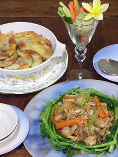 本日、2つ目の日記です。今日から、仕事の人が多いのかしら・・・・頑張ってね!最近、グリーンは何処に行った?ここ、横浜は台風の被害もなく・・・ありがたいことです。赤と黄色のプルメリアは、満開です。白の、花芽がやっとあがって来ました! 遅すぎるぞ・・・・ストレッチアの花芽が、異様に太いような気がします。いったい今回は、何個の花が入ってるのやら、記録更新が楽しみです。白のジンジャーが、長年の観葉植物からやっと抜け出しそうです。(笑)花芽が、上がって蕾が5つほど。早く咲かないか、毎日楽しみなの。咲いたら、日記にフォトUPしますね。夕食メニューです。・かぼちゃとトマトで簡単グラタン・アボガトソースでスティックサラダ・帆立の野菜あんかけ炒めこれ、簡単だけど美味しかった。かぼちゃの甘みとトマトの酸味。素材の味を、楽しんでね。薄切り玉葱1個、刻んだベーコン4枚分。輪切りにした、なす3本を炒めます。味付けは、塩・胡椒だけ。耐熱皿に入れて、トマトスライスを敷き詰めます。さらに、薄切りしたかぼちゃを敷き詰めます。ピザ用チーズを乗せて、オーブンで焼きます。200度で20分ぐらい・・・焼き目が付いたら完成。 かぼちゃとトマトで簡単グラタン by FELLOWこれ、昨日のアボガドソース。残ったので、きゅうりと人参スティック。買い物する時間がなかったから・・・・これだけ(笑)アスパラ・セロリ・インゲンなんかも合うよね。ユカちゃん、プレゼントのグラスありがとう。ブログで、初デビューしました。どうでしょうか?周りにあるのは、小松菜だよ。あんかけは、しっかり味付け。だから小松菜は、お塩入れてさっと炒めただけ。◆作りかたはこちら 帆立の野菜あんかけ by FELLOWしっかり味のあんかけと、小松菜が良い感じ。帆立の代わりに、他の海鮮も美味しいね。応用はイロイロ、冷蔵庫と相談して試してね。今夜のワインはこれ。マコン・シュペリュール2003頒布会のワインです。興味がある方はこちらを見てください。ベルーナワイン頒布会酸味と、甘みのバランスが良かった。重たくもなく、軽すぎず食事が美味しくなるワインだった。かぼちゃの、ホクホク・・・トマトの酸味。これが、さらにワインを美味しくするの。今日も、幸せな時間ありがとうです。 参加しました・・・宜かったらクリックしてくださいね ◆HOME ◆BBS日記 ◆本日のワイン ◆旅行 ◆ウォーキング ◆食器 ◆家作り ◆カテゴリ未分類 ◆我が家のグリーン ◆料理レシピ ◆スイーツ ◆美味しい店