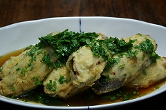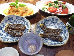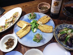 たまった夕飯メニューが、続きます。トップの料理レシピにもUPしました。◆カレー味の鰯のフリッター◆揚げなすと挽肉のみぞれ和え◆焼き大アサリ◆えごねり(佐渡のお土産)特産品です。ゆず醤油で食べました。ダーリンからのプレゼント・・・お皿が、活躍してます。鰯を、カレーパウダーと粉チーズで味付け。パンと野菜、一緒にはさんで食べてもGOOD!レモンを絞っていただきます。◆作り方はこちら カレー味の鰯フリッター by FELLOW付け合せは、モロッコインゲン。きゅうりの梅酢茗荷合えにゴマをトッピング。これは、子ナスを沢山頂いたので。揚げナスと、しそ味噌で炒めた挽肉と大根おろしで今回は、佐渡で買ったしそ味噌使用。ダーリンが、美味しいって喜んでたゆでた、オクラも添えて◆作り方はこちら 揚げナスと挽肉のみぞれ合え by FELLOWこれは、BIRTHDAY旅行のお土産。帰りに、伊勢からフェリーで伊良湖へ。愛知に入り、三河産の大アサリを買いました。お買い得な12個入って1,000円・・・まずは、焼きアサリにしました。すごく大きいでしょ! 本日のワインはこれ。コーペラティヴァ・ディ・レヴェラーノ・レヴェラーノ・ロッソ2004 お値段1,180円 デイリーワインにいかがですか?参加しました・・・宜かったらクリックしてくださいね(^^ゞさて、日曜はダーリンのお店のイベント。あさ5時出発だって 4時には起きなくては・・・イロイロ、仕込みをしてたらこんな時間になっちゃった。◆HOME ◆BBS日記 ◆本日のワイン ◆旅行 ◆ウォーキング ◆食器 ◆家作り ◆カテゴリ未分類