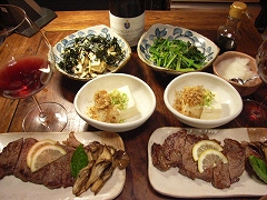 本日は、ダーリンのお店からです。曇り空なのに、蒸し暑~い東京です。さて、夕飯メニューです。・和風ステーキ&舞茸添え 大根おろしとポン酢でいただきました。・冷奴・小松菜の辛し和え ・筍炒めは海苔だらけこちらは、超簡単な1品。ごま油の香りと、たっぷりの海苔筍に合うんだな~。なのに超簡単!!っていいでしょ。◆作り方かこちら 超簡単筍炒めは海苔だらけ by FELLOW今夜のワインはブルゴーニュ・グラン・オルディネール頒布会のワインです。興味がある方はこちらを見てください。ベルーナワイン頒布会このシリーズは、少し酸味が強いかな…だから、肉料理が良く合うね。参加しました・・・宜かったらクリックしてくださいね(^^ゞ◆HOME ◆BBS日記 ◆本日のワイン ◆旅行 ◆ウォーキング ◆食器 ◆家作り ◆カテゴリ未分類