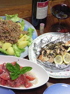 三連休なんだよね!明日は、、敬老の日だね。該当者もいない我が家。休日の、恩恵もないしな・・・ダーリンも、普通に仕事だし。夕食メニューです。・肉味噌でおじゃが・オーブン任せの生鮭のハーブ蒸し・トマトのブルーチーズこの肉味噌は、便利だよ。好みで、ニンニクや生姜を入れてね。なすと絡めたり、冷麺に乗せたり。春雨や椎茸を足して、レタス包みもおいしいよ◆作り方はこちら 肉味噌のおじゃが by FELLOW今日は、圧力鍋でジャガイモを蒸かしました。レタスも一緒に・・・・ホクホクジャガイモと、肉味噌が旨い生鮭は、塩・胡椒をたっぷり。◆作り方はこちらホイルに包んでオーブン任せ。 オーブン任せの生鮭のハーブ蒸し by FELLOW我が家は、モンゴルの荒塩を挽きます。下に敷いたエリンギにも旨みがしみて・・・・シコシコとした歯ごたえも、美味しいよレモンを絞って食べてね!ブルーチーズのトマトサラダ。良く行くブログの、†緋風†さんが作っていました。†緋風†さん、男性ながら中々の料理の腕前。だから、お嫁さん来ないのか?ブルーチーズが好きな人には、おススメ。苦手な人は、止めたほうがいいよ。(^_-)-☆私は、フレンチドレッシングないから普通にドレッシング作ったの。それに、レモンとブルーチーズ入れちゃいました。これは、ワインには最高に合うよ(^_-)-☆美味しいレシピ、ありがとうね、†緋風†さん。今夜のワインは、これ・・・レスプリ・ド・ラ・ネグリ・ドメーヌ・バプティスト・ブート 2004開栓時の香りは、いいですね。酸味が少し強いかな・・・・だから時間がたってからのほうがいいと思いました。トマトのブルーチーズは、美味しく食べれました。かなり、ライトなボディだと思います。今日も、幸せな時間ありがとうです。 参加しました・・・宜かったらクリックしてくださいね ◆HOME ◆BBS日記 ◆本日のワイン ◆旅行 ◆ウォーキング ◆食器 ◆家作り ◆カテゴリ未分類 ◆我が家のグリーン ◆料理レシピ ◆スイーツ ◆美味しい店