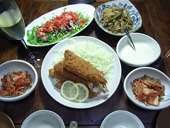 久しぶりの夕飯メニューです。◆エビフライ◆切り干し大根の煮付け。◆キムチ納豆。◆大葉ニンニク醤油αのタコサラダエビフライのソースマヨネーズ・塩・胡椒・酢・みじん切りの玉葱。タルタルソースより、さっぱりしてますよ。クックパッドで人気の大葉ニンニク醤油。ちょっとアレンジで、大葉ニンニク醤油αです。これを使ってタコのサラダ。野菜もたっぷり食べましょう。大葉ニンニク醤油は、簡単で便利だよ。◆作り方はこちら 大葉ニンニク醤油αでタコサラダ! by FELLOWトップページのメニューからも、リンクできます。今日のワインは、またまたスパークリングです。ドネリ・イル・マーレ・スプマンテ さっぱりとした、清涼感のある泡。ゴクゴクいけちゃうわ・・・エッ!飲みすぎ?かもね。以前紹介した、チジミのレシピ。こちらもUPしました。隠し味は、ジャガイモ!是非お試し下さい。◆作り方はこちら チジミには、ジャガイモが隠し味! by FELLOW参加しました・・・宜しかったらクリックしてくださいね(^^ゞ◆HOME ◆BBS日記 ◆本日のワイン ◆旅行 ◆ウォーキング ◆食器 ◆家作り ◆カテゴリ未分類