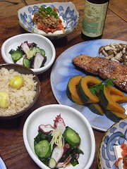 今日は、横浜も暑い、一日でした・・・。お休みの方たちは、ゆっくり休養できたのかな?掃除してたら、汗がとめどなくだらだらと・・・シャワーを浴びてさっぱりしました。ダーリンは、汗かきながら仕事頑張ってるんだろうな。本日、2つ目の日記です。さて、夕飯メニューです。何日か前のになるけどね。・サーモンのムニエル&かぼちゃの煮付けとシメジのソテー・タコとワカメの酢の物・キムチ納豆(良く登場しますね~血液サラサラ!)・栗ご飯小ぶりのかぼちゃを頂いたの。形可愛く、煮てみましたほくほくして美味しい!栗ご飯が食べたくて・・・・でも、この栗が美味しくなかった。甘みがあまり無かったのですご飯は、とっても美味しかったのに・・・・残念近いうちに、リベンジです。この日は、ビール!これは伊勢に行った時に買った、ビール。伊勢志摩限定の、神都ビールなんです。伊勢志摩産古代米使用のビールなんだよ。参加しました・・・宜かったらクリックしてくださいね(^^ゞ以前紹介した、牛肉のワイン煮のレシピ。こちらも、トップの料理レシピにもUPしました。是非お試し下さい。◆作り方はこちら 牛肉の野菜炒めはワインでお化粧 by FELLOWこんな御釜で炊いたら美味しいだろうな!!剥き栗も売ってる楽天って、すごいね!栗イカご飯だって・・・やっぱり、美味しい生栗かな。栗むくのに便利だね!◆HOME ◆BBS日記 ◆本日のワイン ◆旅行 ◆ウォーキング ◆食器 ◆家作り ◆カテゴリ未分類