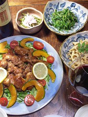 本日も、小雨の横浜です。今朝は、肌寒いです・・・涼し過ぎ。昨日の日記のもろこ、こっちが正解だったようです。これがもろこ大きくて、怖い顔だわ・・・帰宅したダーリンに間違いを指摘されました。夕食メニューです。・鶏の照り焼き&たっぷり野菜とかぼちゃ・ほうれん草の胡麻和え・レンコンのキンピラ・漬物照り焼きは、スペアリブ用のタレに漬けました。作り方は、一昨日の日記に出ています。やっぱりオレンジジュースが、決め手です。いい照りですね・・・下には野菜がいっぱい。かぼちゃは、薄くスライスして。バターを乗せて、レンジでチン!!かぼちゃの甘みが、凝縮されます。付け合せにも、綺麗でしょ・・・・ダーリンのお皿に映えるわ。これは、レンコンのキンピラ。みんなも良く作るかな?シャキシャキした、食感が好きなの。鷹の爪は、お好みでね。今日は、イタリア土産の唐辛子オイル入り。◆作り方はこちら レンコンのキンピラ by FELLOW今夜のワインはこれ。リヴェラ・テッラニーマ・プーリア・ロッソ2004このワインは・・・・[トッレヴェント・カステル・デル・モンテ・ロッソ 2003][ウマニ・ロンキ・ビアンキ・モンテプルチアーノ・ダブルッツオ2004]これを合わせたようなワイン。この言葉が、買いの決め手!!特に、ビアンキは2年ほど前からのお気に入りのイタリアワイン。開けたてから、甘酸っぱい果実の香りが開いてる。タンニンが、程よく効いて・・・チキンと食べると、さらにワインが美味しい。幸せ~ な時間です。参加しました・・・宜かったらクリックしてくださいね(^^ゞ 以前紹介した、おからDEグラタンと、モヤシとワカメのさっぱりサラダのレシピ。こちらも、トップの料理レシピにもUPしました。是非お試し下さい。◆作り方はこちら おからDEグラタン by FELLOW もやしとワカメのさっぱりサラダ by FELLOW ◆HOME ◆BBS日記 ◆本日のワイン ◆旅行 ◆ウォーキング ◆食器 ◆家作り ◆カテゴリ未分類 ◆カテゴリ未分類 ◆我が家のグリーン ◆料理レシピ ◆スイーツ ◆美味しい店
