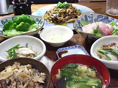 昨夜は、4時頃の雷で目が覚めてしまいました。その後の、土砂降りの雨・・・・あわてて窓を閉めました。今朝は、雲空だったけど、お日様が出てきた横浜です。昨日、訪問したmiy310さんの日記。美味しそうな、茸とホッキの炊き込みご飯が載っていました。北海道は、いいね・・・・というわけで今夜は茸ご飯です。帰宅した、ダーリンはカンパチのお刺身がお土産。お店のお客様が釣ったんだって!!嬉しいな・・・・・なすのマーボ炒め・茹でブロッコリー・カンパチの刺身・タコともやしの酢の物・茸の炊き込みご飯(舞茸・エリンギ・油揚げ)・超簡単レタススープ酒・昆布・出し醤油を入れて。エリンギ・舞茸・油揚げも入れて。後は、炊飯器にお任せ。今日は、新潟で買ってきた赤米も入れてみました。煤田さんが、栽培した赤米です。「古代の稲品種」が持ってた特色を残した稲。中国では、薬米として利用・・・と書いてある。プチプチとした歯ごたえが、中々美味しいです。レタスは、βカロチン、ビタミンC、E、カルシウム、鉄、カリウム、食物繊維が一杯とっても身体にいいんだよね。炒めると、沢山食べれるよ!シャキシャキ感が美味しくて、色も綺麗。◆作り方はこちら 超簡単レタススープ by FELLOW以前、イカで酢味噌合え作ったけど・・・これは海鮮に合うよね。帆立、赤貝、青柳とかね・・・・今日は、キュウリやワカメ忘れた!◆造り方はこちら タコのとモヤシの酢味噌和え by FELLOW参加しました・・・宜かったらクリックしてくださいね(^^ゞ 以前紹介した、イカと野菜のワインソテーと鶏のスペアリブはオレンジと仲良しのレシピ。こちらも、トップの料理レシピにもUPしました。是非お試し下さい。◆作り方はこちら イカと野菜のワインソテー by FELLOW 鶏のスペアリブはオレンジと仲良し by FELLOW◆◆イロイロな、料理の本・・・貴方のお気に入りはどれ?◆◆ ◆HOME ◆BBS日記 ◆本日のワイン ◆旅行 ◆ウォーキング ◆食器 ◆家作り ◆カテゴリ未分類 ◆我が家のグリーン ◆料理レシピ ◆スイーツ ◆美味しい店
